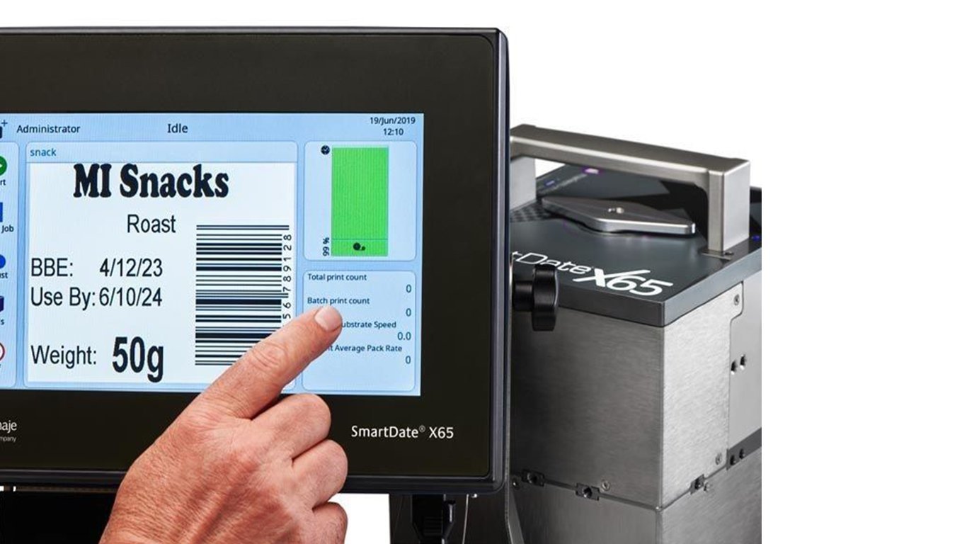SmartDate X65, diseñado para las aplicaciones de gran carga de trabajo más exigentes, ofrece una codificación de alta resolución en envases de película flexible (hasta 455 paquetes por minuto). Su interfaz de usuario de 10,1’’ totalmente intuitiva facilita las operaciones diarias y las simplifica al tiempo que proporciona la información que más necesita para optimizar y mejorar la eficiencia general de los equipos (del inglés, OEE) en el sistema de informes MI Sigma.